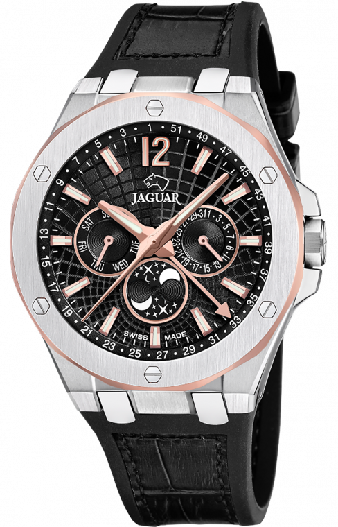Функционал Jaguar J1040/4 включает индикацию даты, дня недели, номера недели и фазы луны, что делает их полезными для планирования и отслеживания времени. Лунный календарь добавляет эстетическую и практическую ценность, а многофункциональность позволяет использовать часы в различных ситуациях. Водонепроницаемость до 10 бар (10 атм) обеспечивает защиту от влаги во время плавания или активного отдыха, а каучуковый ремешок черного цвета с классической пряжкой гарантирует комфорт и надежную фиксацию на запястье.